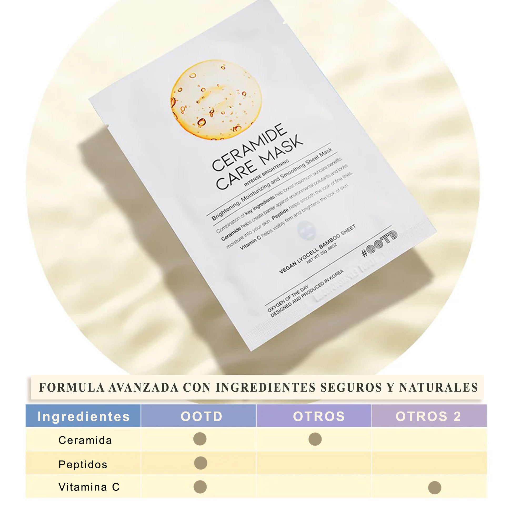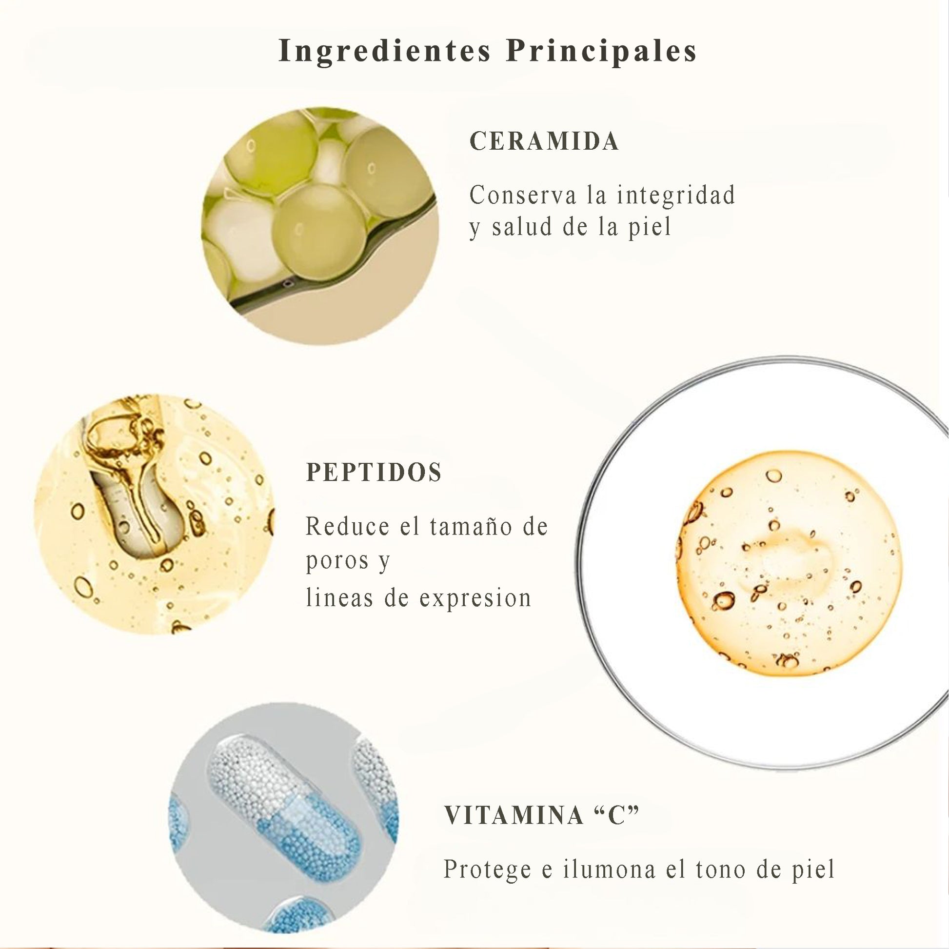 Esta mascarilla facial con ceramidas ha sido formulada para convertirse en tu mejor aliada si buscas una piel visiblemente más luminosa, hidratada y con textura suave. Gracias a su poderosa combinación de ceramidas fortalecedoras, vitamina C iluminadora y un exclusivo complejo de péptidos, no solo revitaliza tu rostro: repara, protege y transforma.