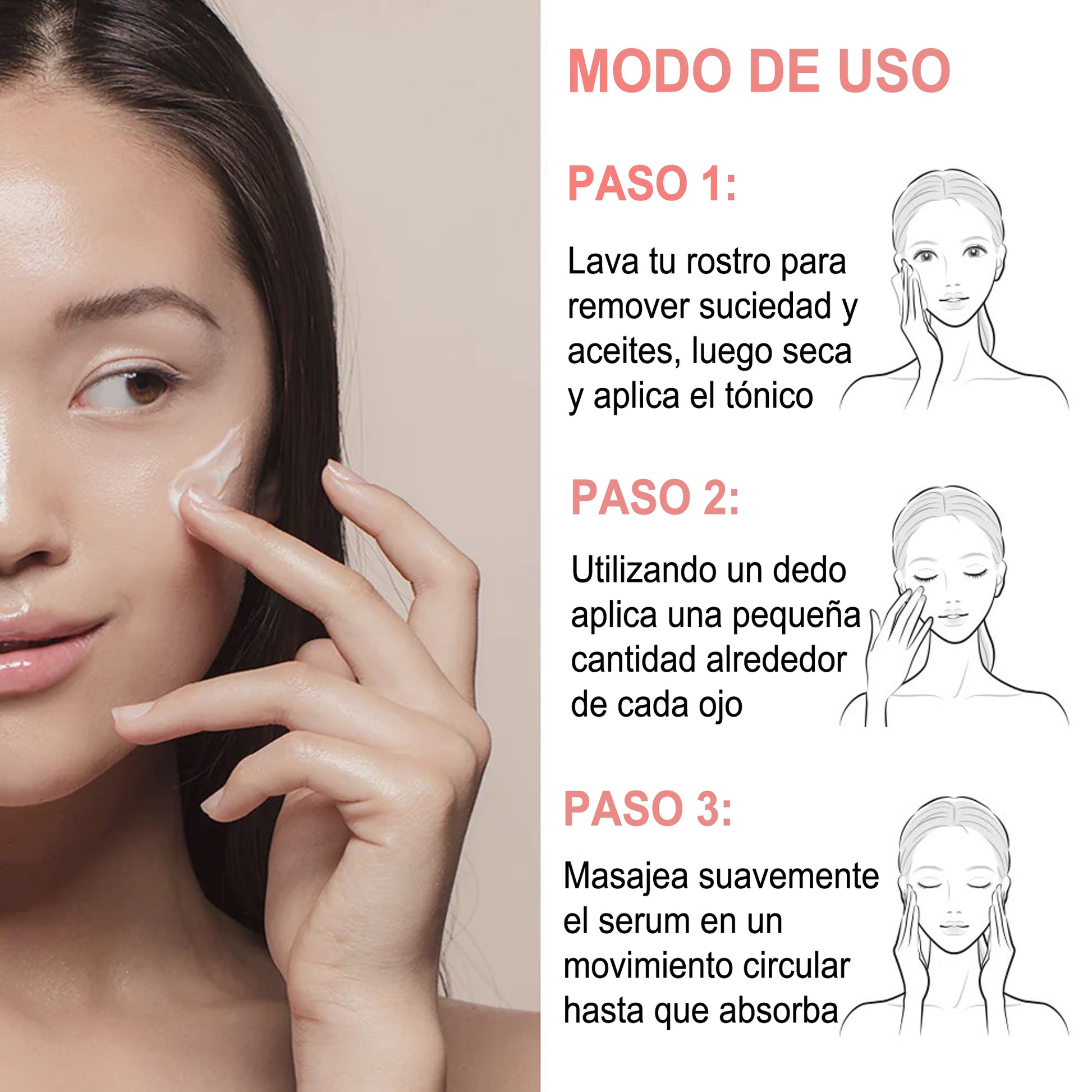 1. Aplique una cantidad del tamaño de un guisante del tubo en la punta de un dedo. 2. Con el dedo, dé suaves golpecitos a lo largo del hueso orbital cada mañana. 3. Repita este proceso en cada ojo. 4. Aplique la crema hidratante después de que la piel haya absorbido completamente el sérum. |