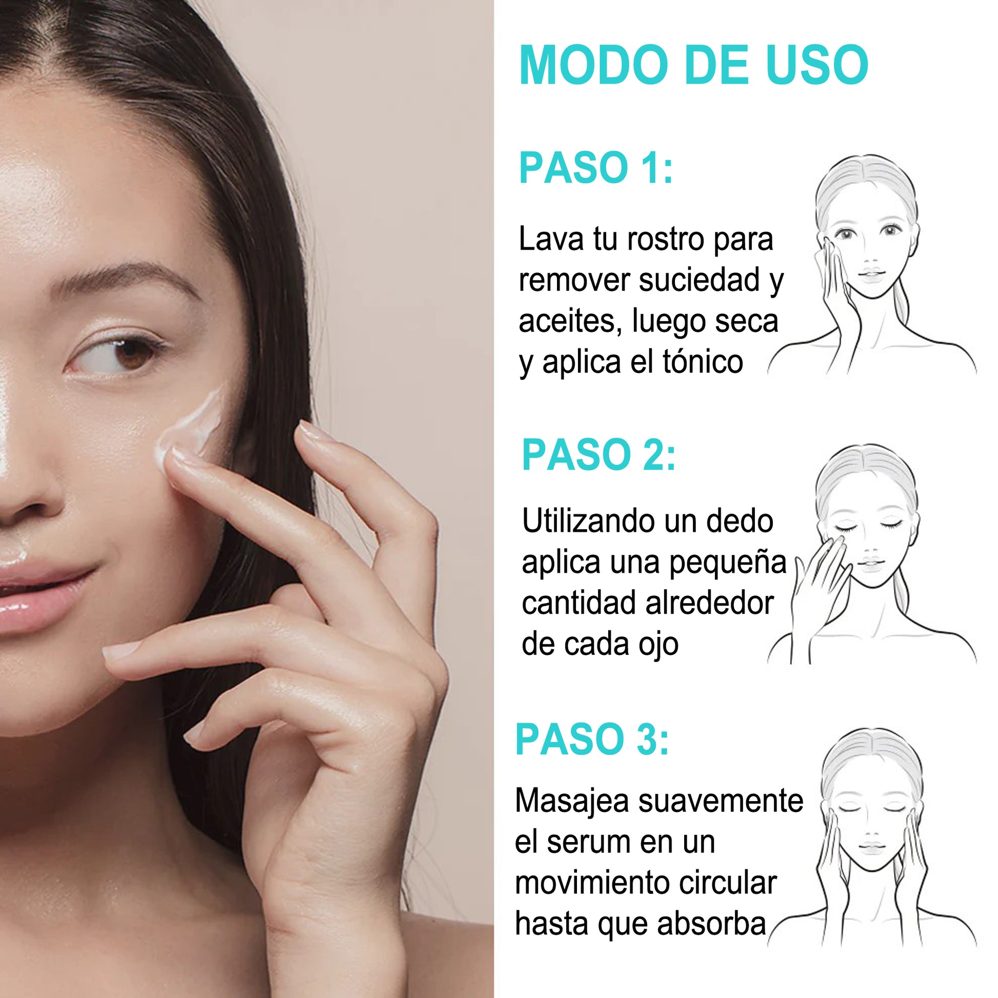 1. Aplique una cantidad del tamaño de una arveja en la punta de un dedo. 2. Con el dedo, dé suaves golpecitos a lo largo del hueso orbital cada mañana. 3. Repita este proceso en cada ojo. 4. Aplique la crema hidratante después de que la piel haya absorbido completamente el sérum. |